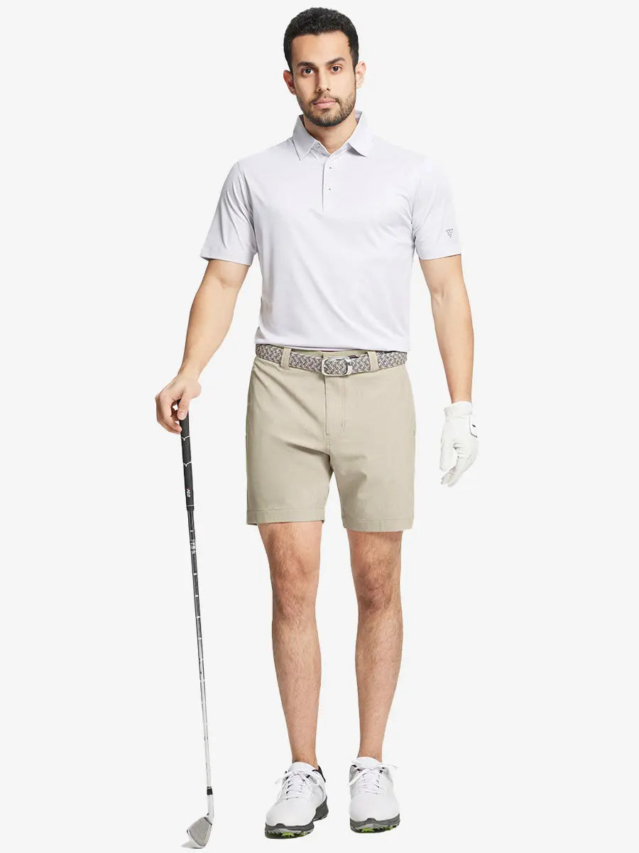 Introducing our Heather Performance Golf Shorts, designed for comfort and flexibility with skin-friendly materials and excellent stretch. These men's shorts feature moisture-wicking, quick-dry, and UPF 50+ properties for breathability and coolness. Enhanced with stylish heathered details, they are perfect for the golf course or casual wear, blending fashion with function effortlessly.